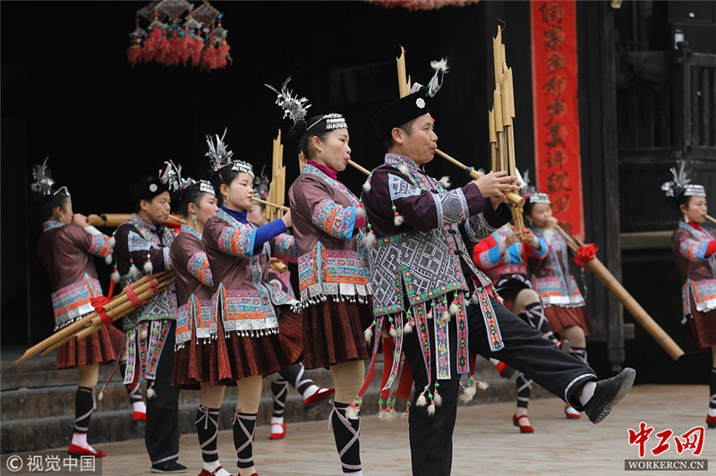 2019年1月27日,广西三江侗族自治县林溪镇平寨的侗族群众吹奏芦笙迎新春。王滋创/视觉中国