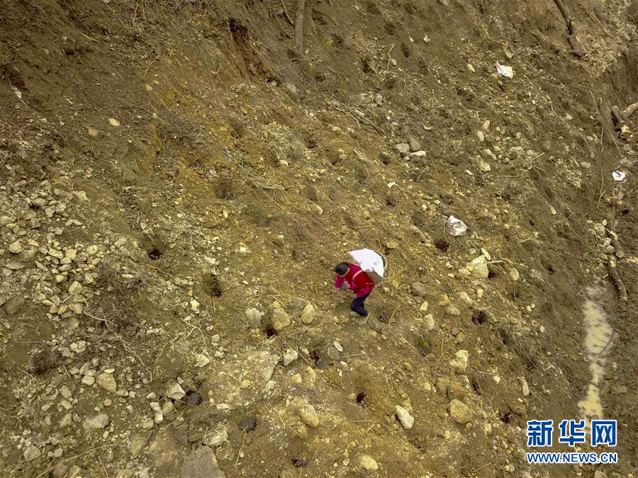 一名长春村村民背着肥料沿着陡坡艰难前行(1月24日无人机拍摄)。 新华社记者 刘潺 摄