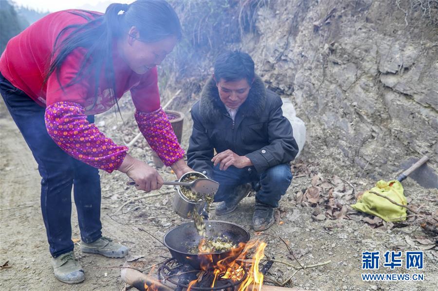 腾树长(右)和村民一起加热带来的咸菜饭(1月24日摄)。 新华社记者 刘潺 摄