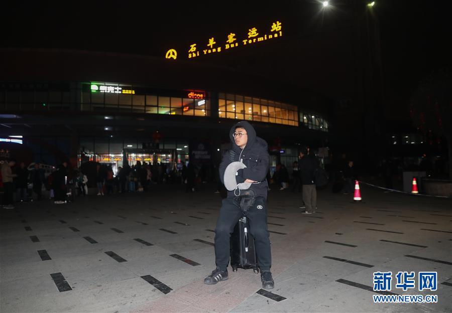 1月26日凌晨,因时间尚早,杨孟平在成都石羊客运站门前等待进站。 新华社记者 薛玉斌 摄