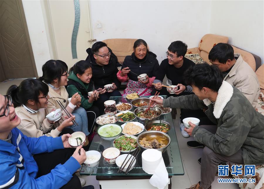 1月27日,杨孟平在家与亲戚朋友一起吃午饭,他边吃边分享旅途中的故事。 新华社记者 丁汀 摄