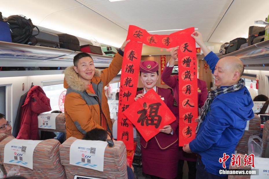 1月28日,正值小年,北京南站开往上海虹桥的G7次“复兴号”动车组内,乘务组与旅客猜灯谜,并为旅客送上对联和“福”字,祝福旅客旅途顺利。中新社记者 贾天勇 摄