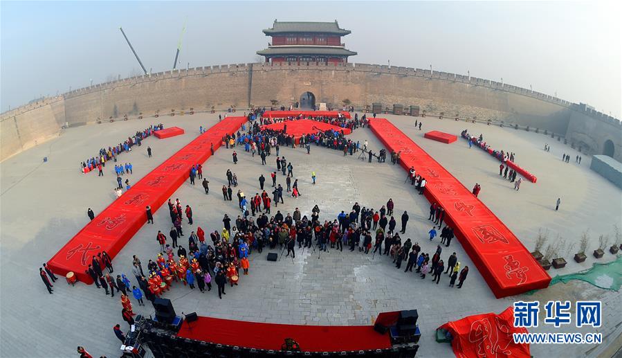 1月28日,一幅巨大的春联亮相石家庄正定古城长乐门文化广场。 当日是农历腊月二十三,我国北方的“小年”,人们以各种形式营造喜庆祥和的节日气氛。 新华社发(张晓峰 摄)