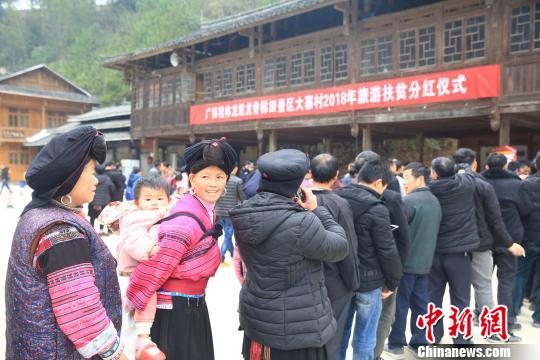 1月28日,广西桂林市龙胜各族自治县龙脊梯田景区大寨村举行“2018年旅游扶贫分红仪式”。大寨村271户、1232人共领取了670万元的“年终奖”,最多的一户分到5.6万元。通过发展旅游,大寨村如今是当地远近闻名的“旅游致富村”,村民成为“扛着犁耙种田地,唱着山歌搞旅游”的“两栖农民”。