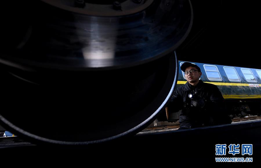1月28日,天津动车客车段库检车间甲班工作人员笪展在检修列车车底。新华社记者岳月伟摄