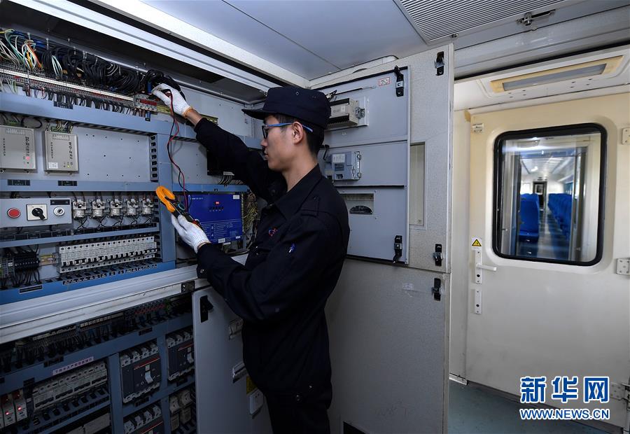 1月28日,天津动车客车段库检车间甲班工作人员孙敬武在检修列车电压。新华社记者岳月伟摄