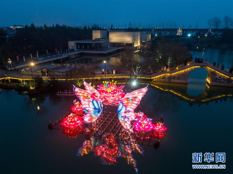 1月28日无人机拍摄的乌镇景区内的比翼双飞彩灯。新华社记者 徐昱 摄