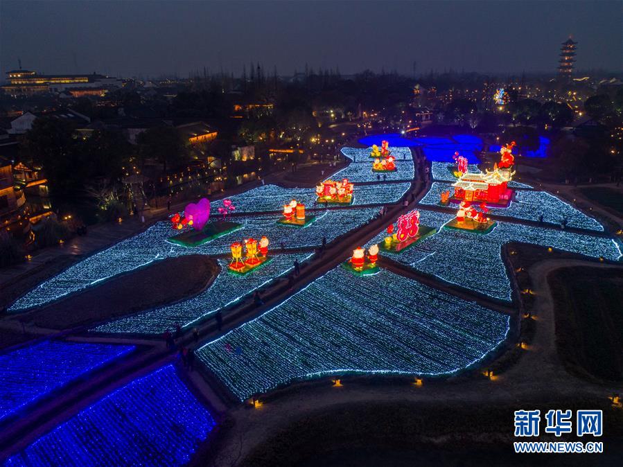 1月28日无人机拍摄的乌镇景区内的金猪闹春彩灯。新华社记者 徐昱 摄