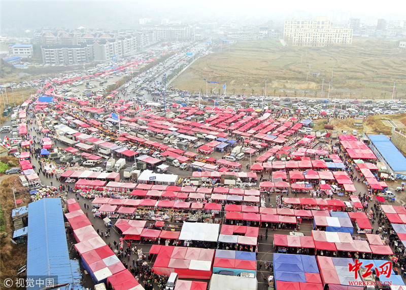 2019年1月27日,贵州长顺县广顺镇。由于春节临近,乡场上的商品应有尽有,鸡鸭魚肉丰富不说,各种日用百货,过年用的春联糖果更是丰富多彩。吴东俊/视觉中国