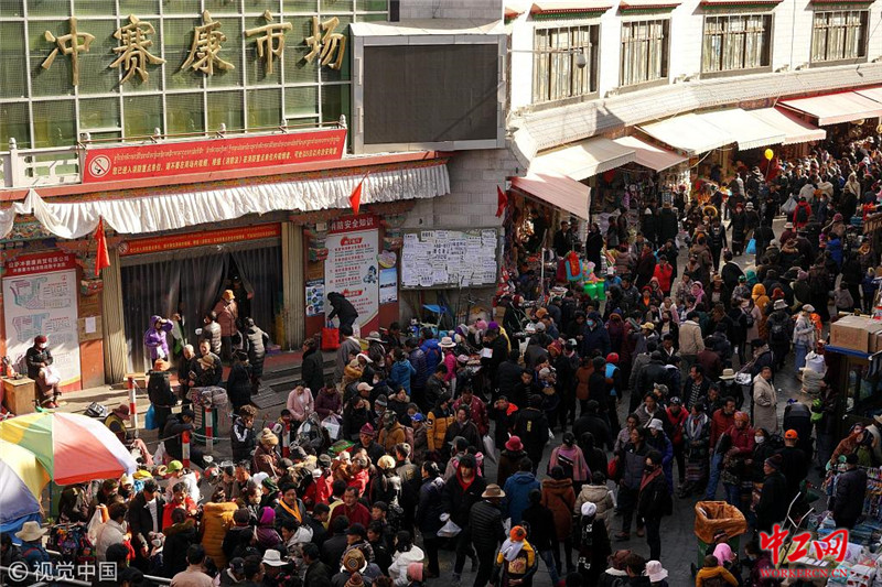 2019年1月22日,拉萨冲赛康市场周边购买年货的民众比肩继踵、热闹非凡。 江飞波(西藏分社)/中新社/视觉中国