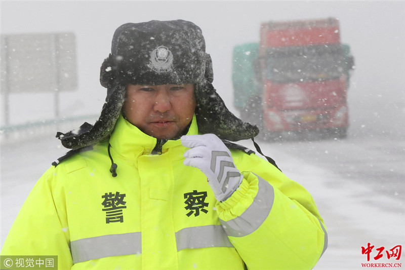 2019年1月28日,新疆哈密,连霍高速新疆哈密沙泉子段民马彬在雪中疏导交通。蔡增乐/视觉中国
