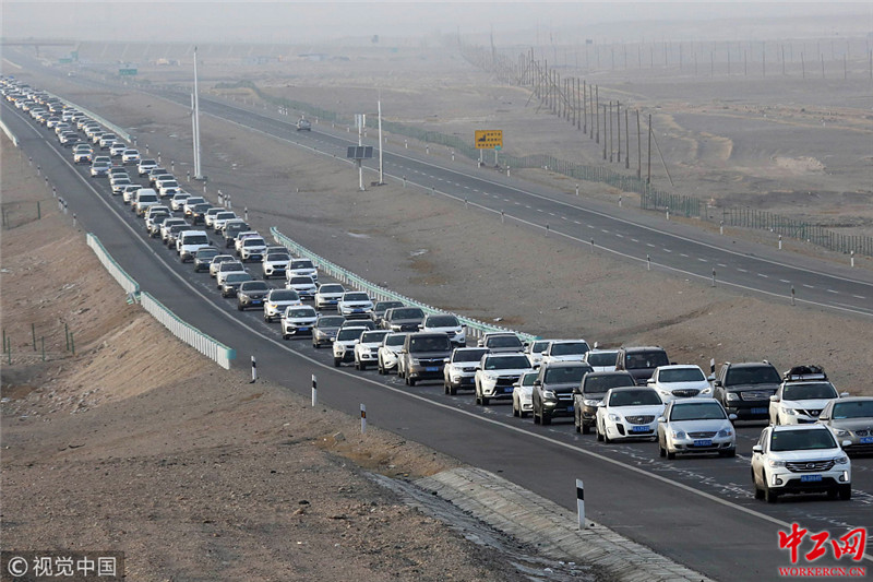 2019年1月28日,新疆哈密,连霍高速新疆哈密骆驼圈子段车辆在民警的引导下安全驶出风雪路段。蔡增乐/视觉中国
