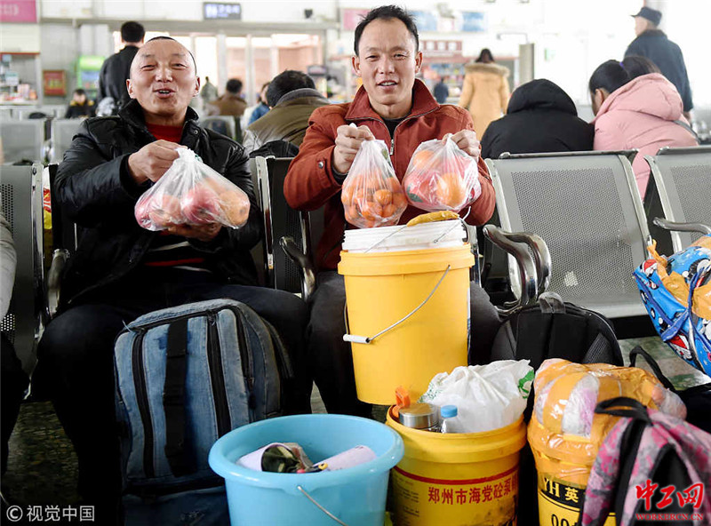 2019年1月28日,河南省洛阳火车站,准备回四川江油的旅客,他们的桶里装的都是车上吃的水果。张怡熙 LOOK洛阳/视觉中国