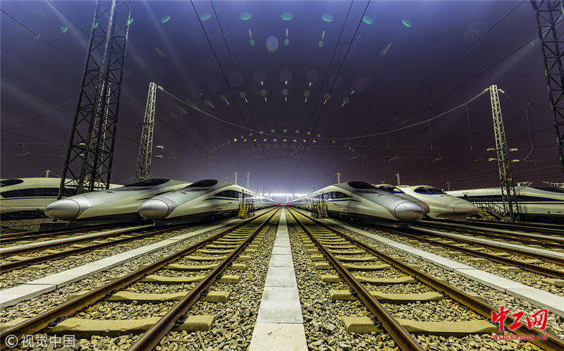 武汉:动车组列车集体“静候”春运到来 场面震撼