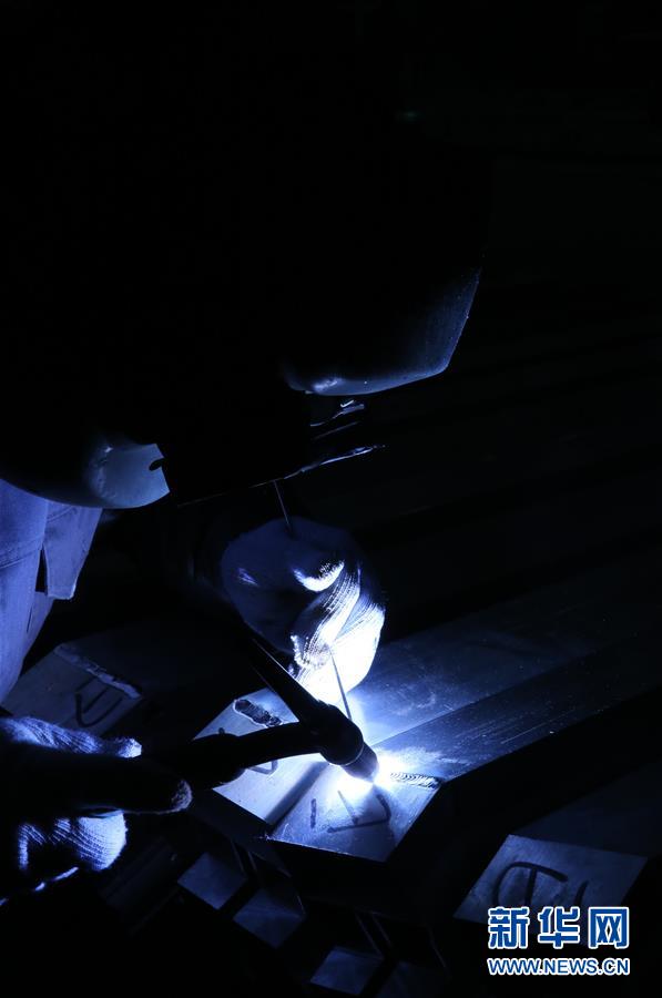 一名工人在山东邹平市魏桥铝深加工产业园区一家企业的生产车间进行焊接作业(2019年1月11日摄)。 新华社记者潘思危摄