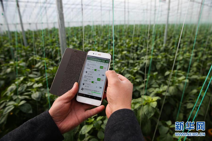 在山东寿光市稻田镇崔岭西村,村民崔江元通过手机调控智能化蔬菜大棚的温度和湿度(2019年1月8日摄)。 新华社记者潘思危摄