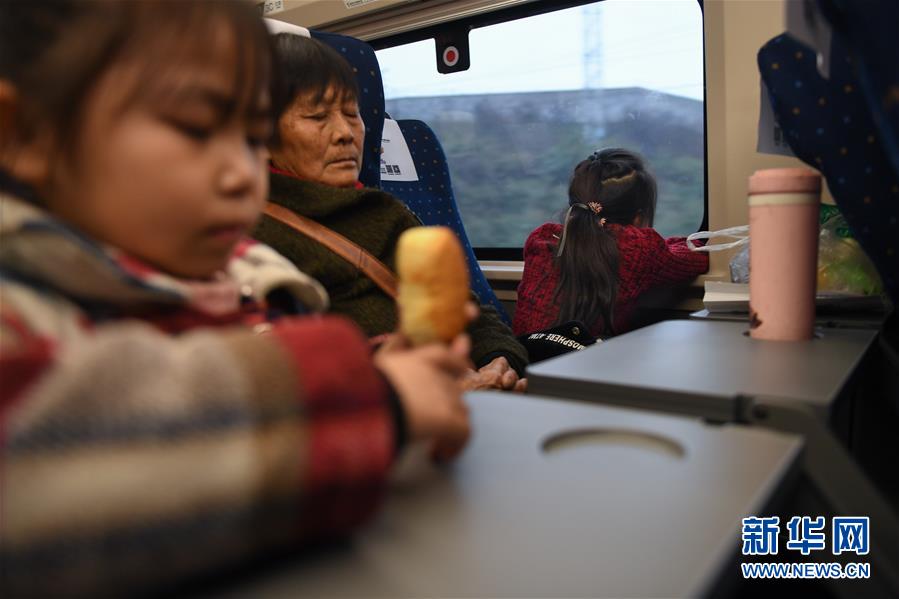 1月24日,在重庆开往福州的G1755次列车上,黄诗韵(右)望着窗外出神,一旁的奶奶疲惫地闭上眼睛休息,妹妹若无其事地吃着零食。新华社记者 宋为伟 摄