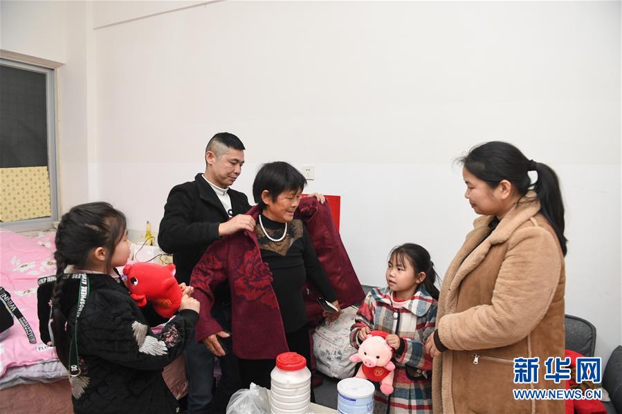1月24日,在公司宿舍,黄浩然帮母亲穿上新衣。新华社记者 宋为伟 摄