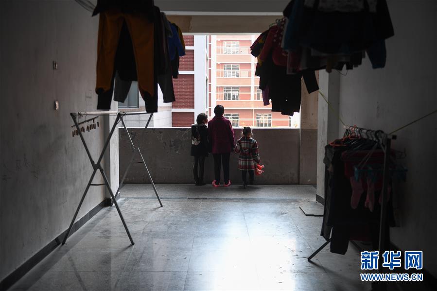 1月25日,在福建省福清市祥兴(福建)箱包集团有限公司,祖孙三人在宿舍走廊望着厂区。由于工厂还未放假,带孩子的担子依然落在奶奶彭著兰的肩上。新华社记者 宋为伟 摄