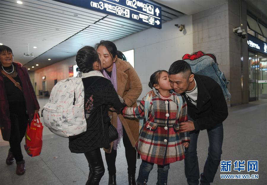 1月24日,在福州南站,黄诗韵(左二)、黄嘉韵(右二)姐妹俩亲吻前来接站的父母。新华社记者 宋为伟 摄