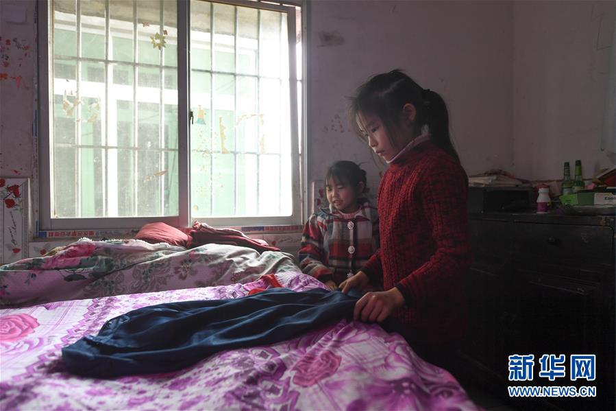 1月23日,在四川省隆昌市黄家镇木匠冲村,姐姐黄诗韵(前)在屋里收拾衣服。新华社记者 宋为伟 摄