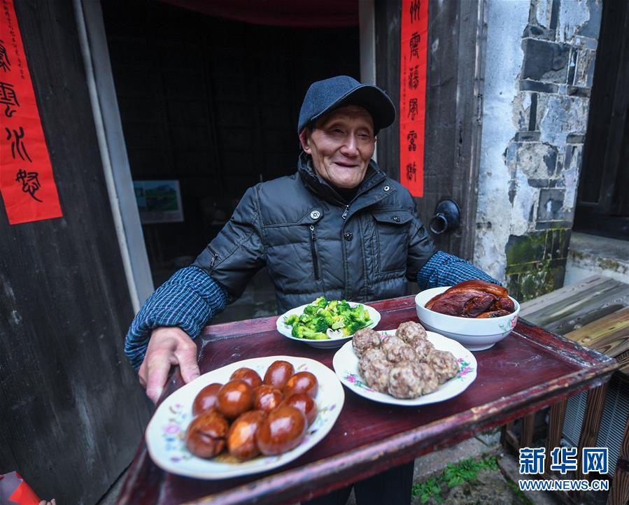 1月29日,村民丁连庆把烧好的当地菜肴端到义皋村老屋的饭桌上。 春节临近,浙江省湖州市织里镇义皋古村内灯笼高挂、“福”字盈门,呈现出一派浓郁的节日气氛。近年来,织里镇启动义皋古村历史文化村落保护工程,重新展现了村落内外的稻文化、鱼文化、溇港文化等历史文化景观。古村焕发新生,成为当地古村落保护和美丽乡村建设的典范。 新华社记者 徐昱 摄