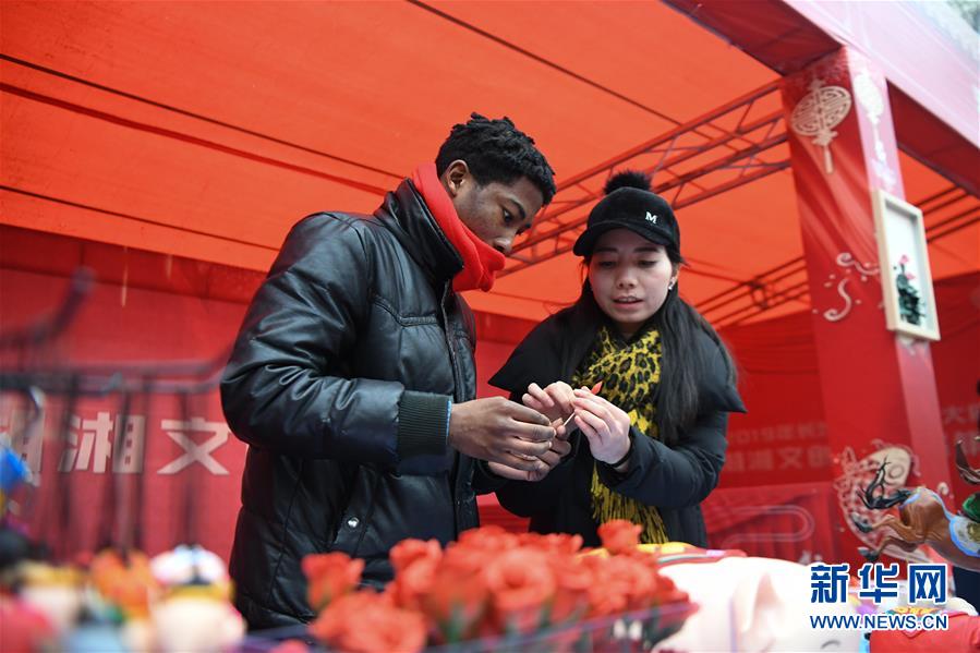 1月29日,长沙理工大学的加纳留学生(左)在庙会上体验捏面塑。 春节临近,湖南长沙多所高校的留学生来到长沙市黄兴路步行街,表演舞龙、逛庙会,感受中国传统节日文化。 新华社记者 薛宇舸 摄