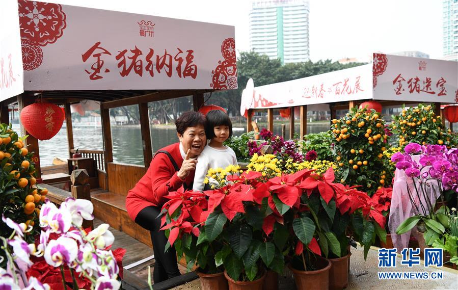 1月29日,市民在广州水上花市留影。 当日,“迎新春·百花展”广州水上花市在荔湾区荔枝湾景区开市。今年广州水上花市将持续至2月3日。 新华社记者 邓华 摄