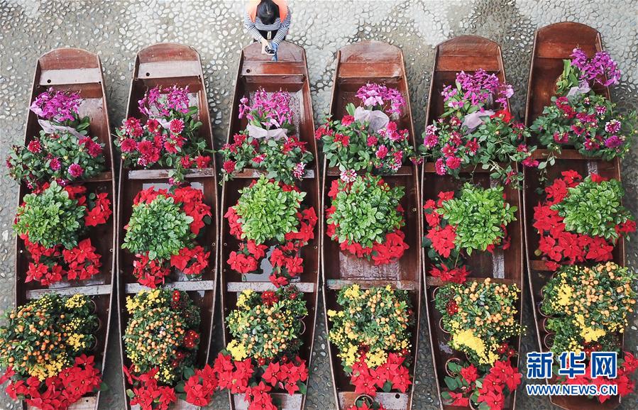 这是1月29日在广州水上花市拍摄的花(无人机拍摄)。 当日,“迎新春·百花展”广州水上花市在荔湾区荔枝湾景区开市。今年广州水上花市将持续至2月3日。 新华社记者 邓华 摄