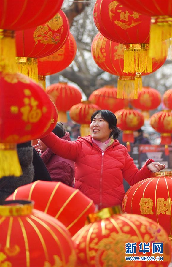 1月29日,市民在山东省淄博市沂源县东里镇年货大集上选购红灯笼。 春节临近,各地一片红火迎新春的浓浓年味。 新华社发(赵东山 摄)