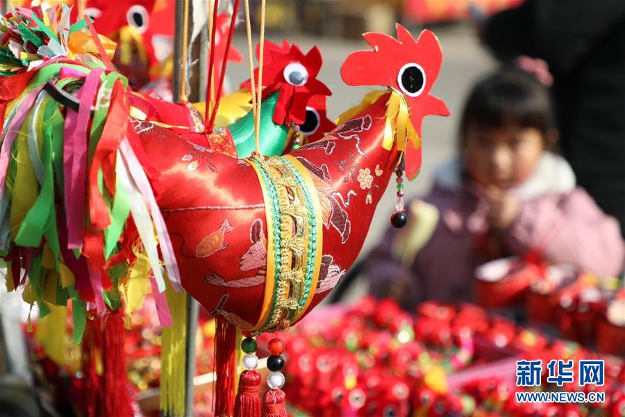1月29日,在山东省临沂市郯城县街头,一名小女孩被“春鸡”所吸引。 春节临近,各地一片红火迎新春的浓浓年味。 新华社发(张春雷 摄)