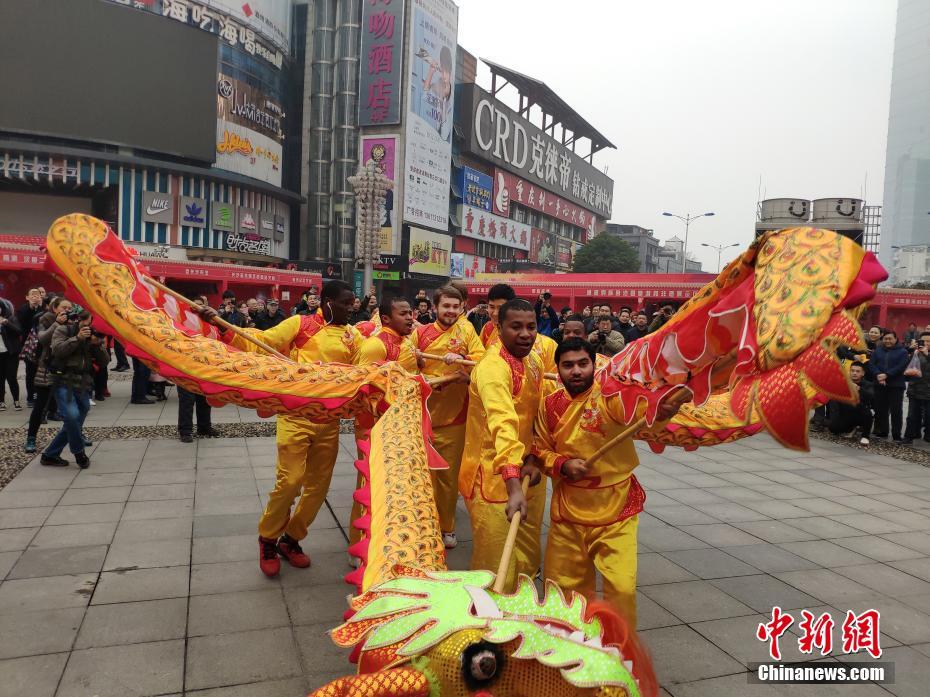 1月29日(农历腊月二十四)是中国南方地区的“小年”,在2019年长沙火宫殿城大庙会上,由来自法国、美国、孟加拉国等国留学生组成的中南大学国际学院舞龙队为观众呈现了别样的舞龙表演。中新社记者 王昊昊 摄