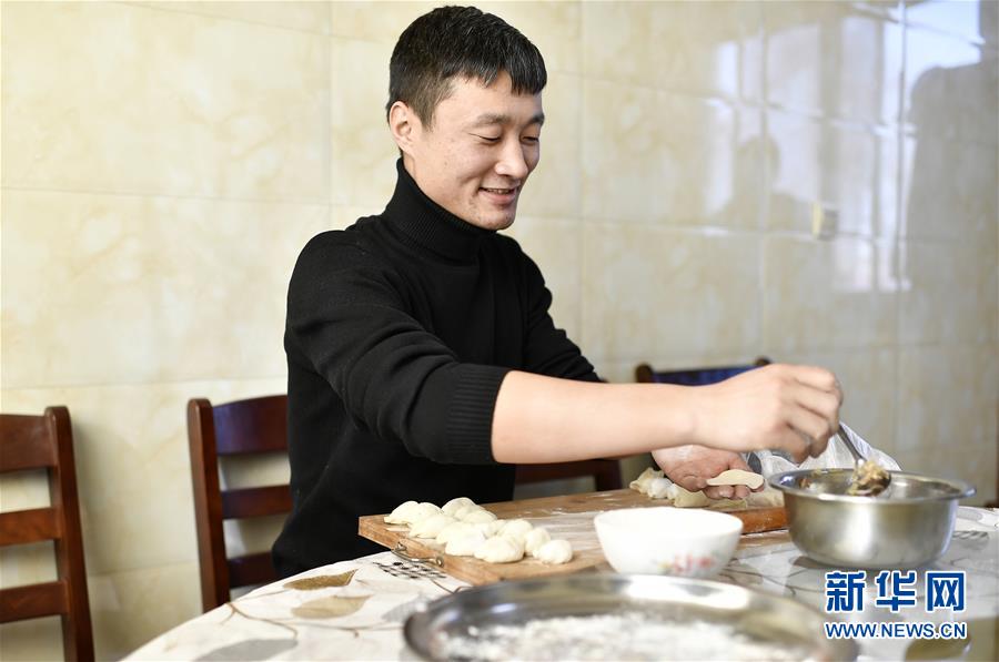 苟发伟在为怀孕三个月的妻子罗亚坤包饺子(1月23日摄)。新华社记者王鹏摄