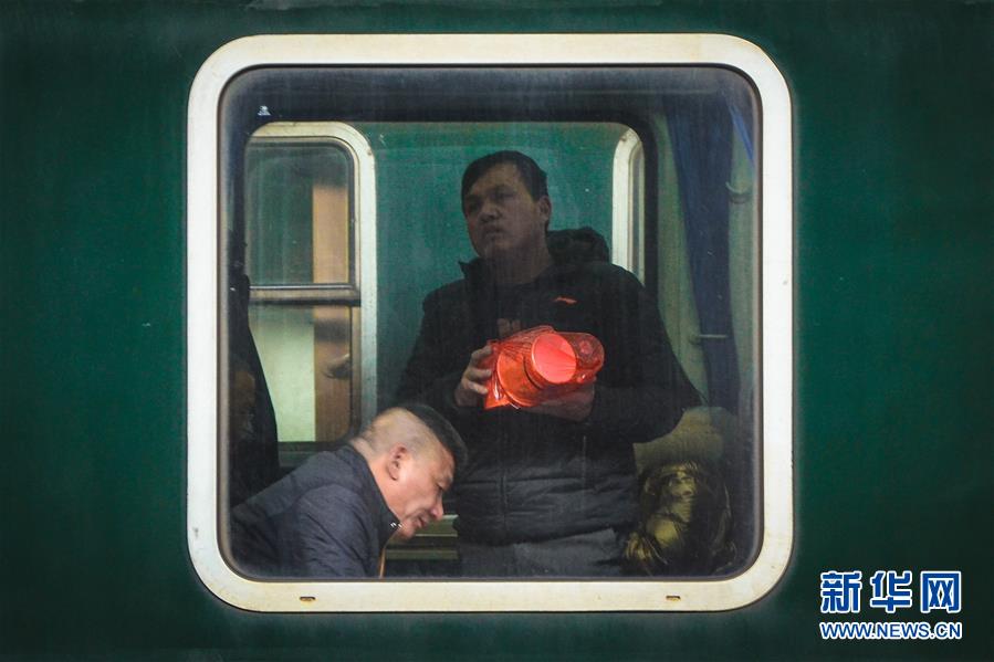 1月29日在浙江省宁波市火车站内拍摄的车厢内的旅客。 春运列车的车窗犹如一个个相框,每个相框内都是一个回家的故事。 新华社发(殷福军 摄)