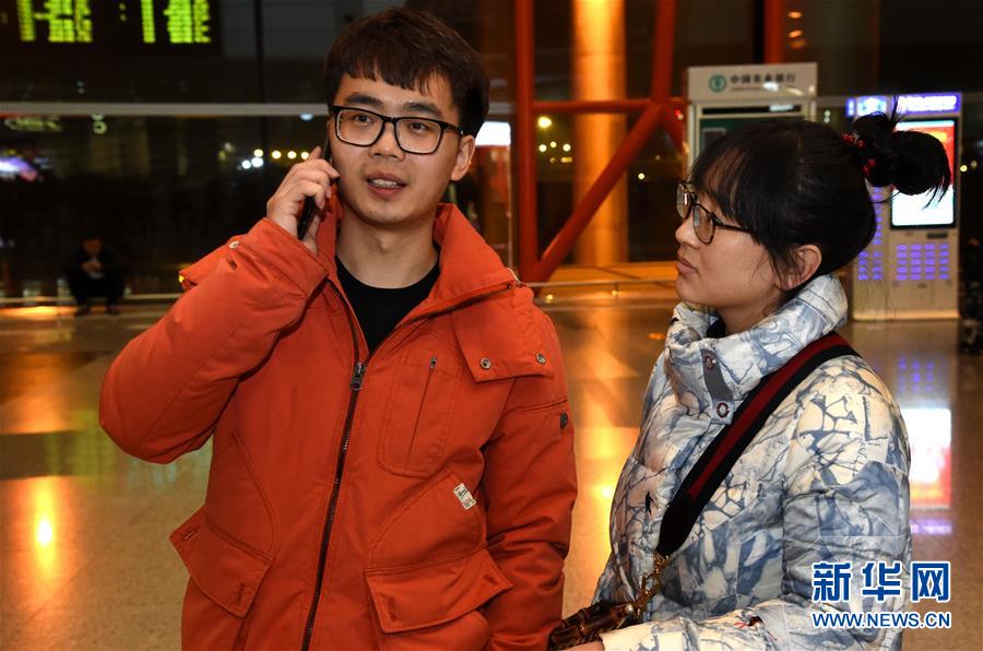 1月30日,孙立(左)打电话确认父亲乘坐的飞机是否到达。 新华社发(任超摄)