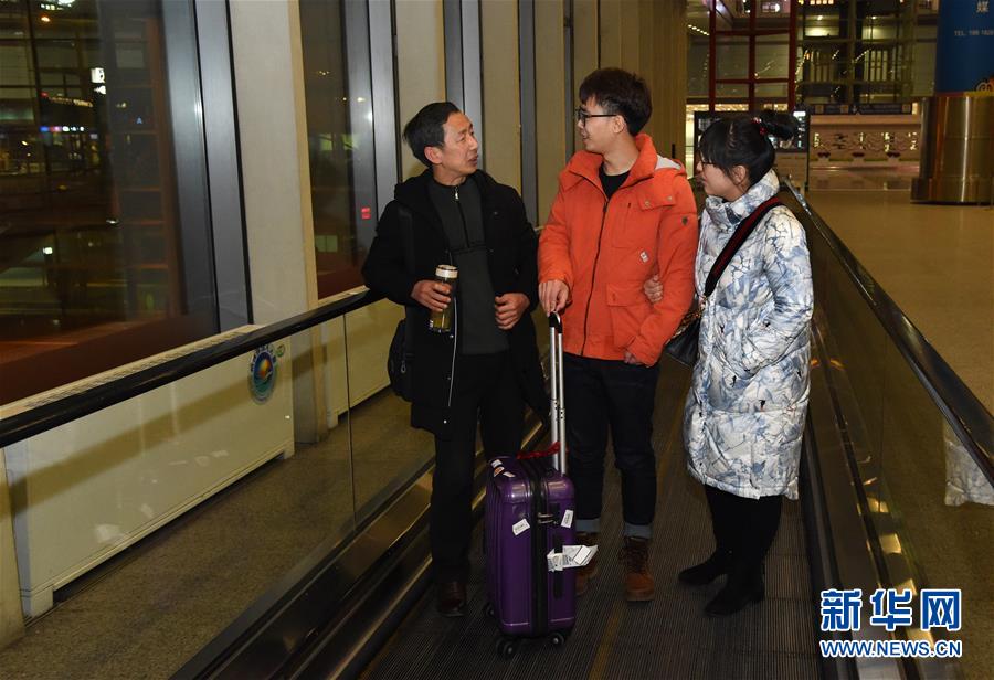 1月30日,孙立的父亲(左)与孙立(中)、刘洁走在回家的路上。新华社发(任超摄)