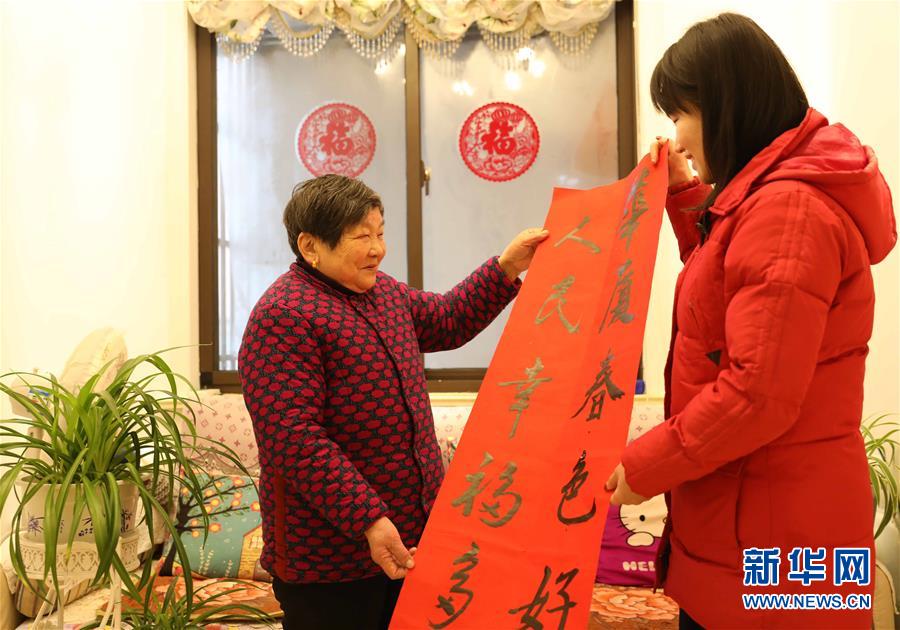 1月30日,在合肥市经开区锦绣社区,志愿者到居民家里送春联。 当日,合肥市经开区锦绣社区方兴居委会在方兴城市生活e站举办“书墨迎新年,巧剪福窗花”活动,传递新春祝福。 新华社记者 曹力 摄