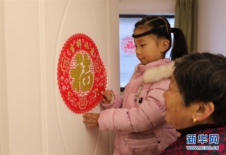 1月30日,在合肥市经开区锦绣社区,小志愿者帮老人贴窗花。 当日,合肥市经开区锦绣社区方兴居委会在方兴城市生活e站举办“书墨迎新年,巧剪福窗花”活动,传递新春祝福。 新华社记者 曹力 摄