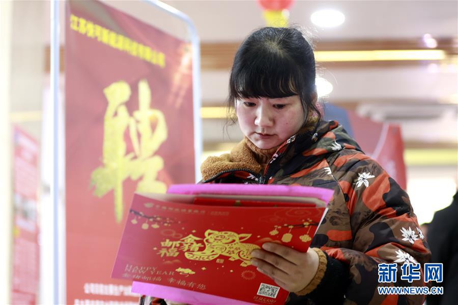1月30日,在盱眙县人力资源市场,返乡农民工在招聘会现场浏览招聘信息。