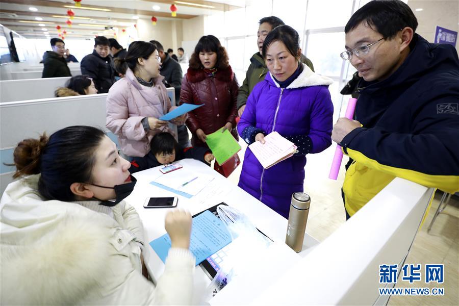 1月30日,在盱眙县人力资源市场,返乡农民工在招聘会上咨询。