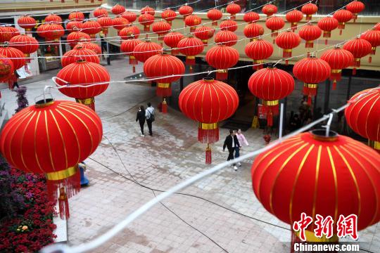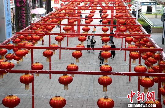 图为市民在火红的灯笼下行走。 张斌 摄