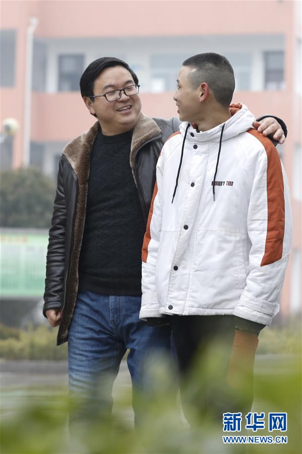 1月30日,在江苏淮安市盱眙县仇集中学,“山爸”吴凯询问孩子的学习情况。 新华社发(颜怀峰 摄)