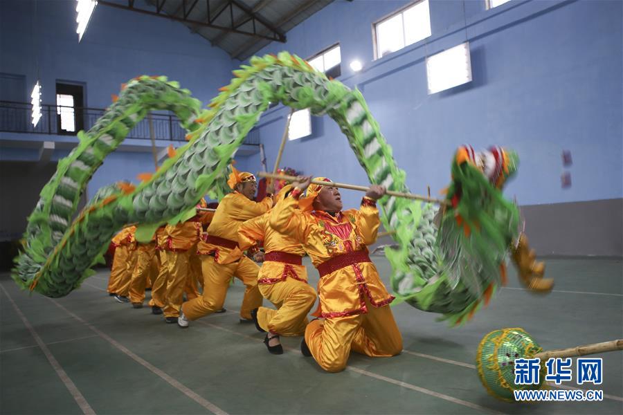 1月30日,江苏省淮安市洪泽区蒋坝镇农民在排练舞龙节目,为新春演出做准备。 春节临近,各地洋溢着喜庆的气氛。 新华社发(万震 摄)