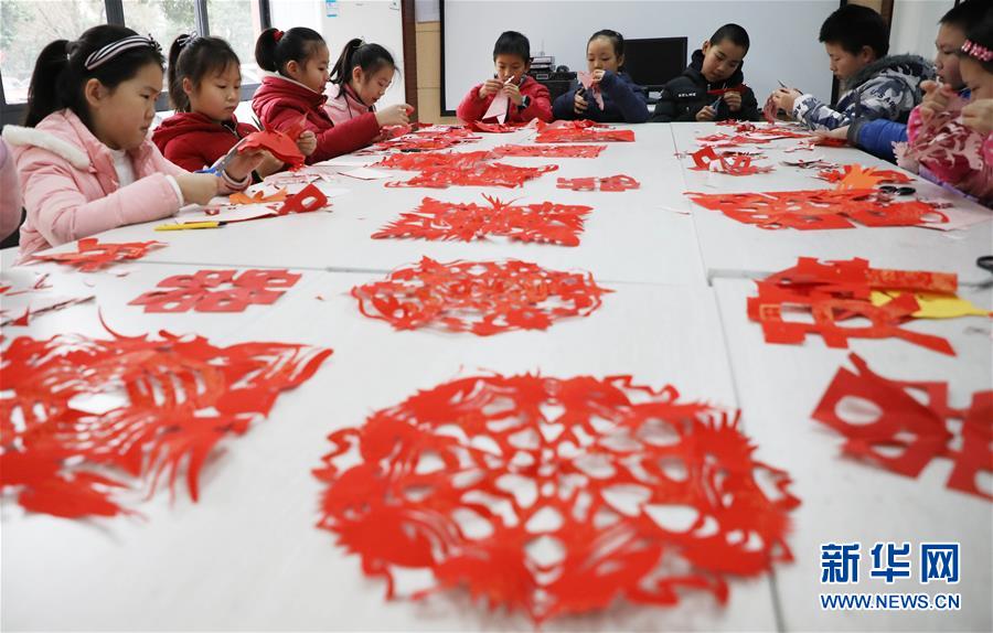 1月30日,苏州工业园区新城社区的孩子们在一起剪窗花。 春节临近,各地洋溢着喜庆的气氛。 新华社发(杭兴微 摄)