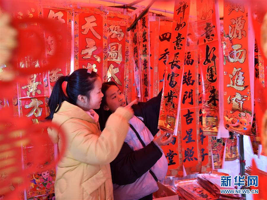 1月30日,市民在贵州省黔东南苗族侗族自治州丹寨县年货市场选购春联。 春节临近,各地洋溢着喜庆的气氛。 新华社发(潘皇权 摄)