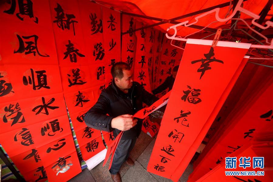 1月30日,市民在广西桂林全州县年货市场上选购春联。 春节临近,各地洋溢着喜庆的气氛。 新华社发(王滋创 摄)