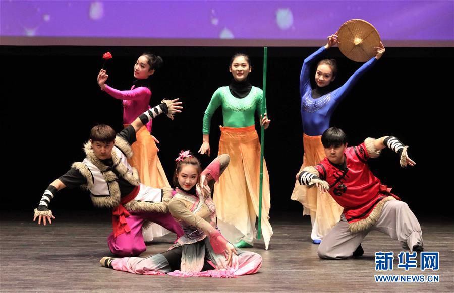 1月29日,在科威特哈瓦利省,来自南京艺术团的演员在“2019新春音乐会”上表演舞蹈。新华社发(约瑟夫摄)