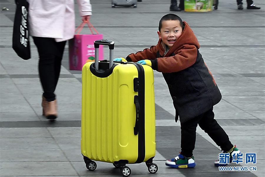1月30日,在郑州火车站东广场,一名小朋友推着行李箱准备进站乘车。 新华社记者 李安 摄