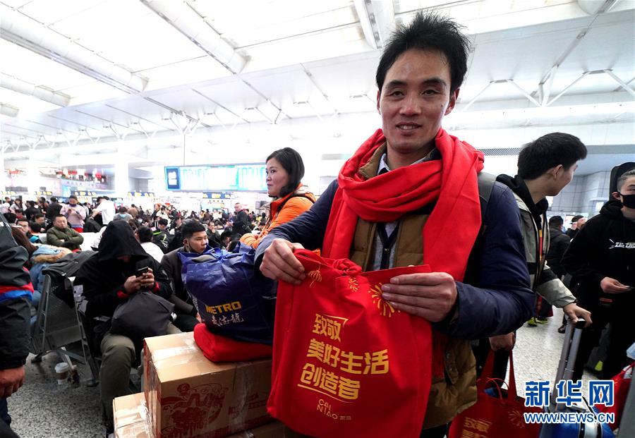 1月30日,快递员张义好(前)在上海虹桥火车站候车。 新华社记者 陈飞 摄