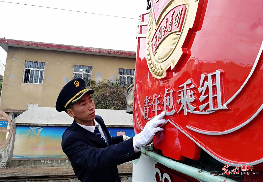 2019年1月30日,成昆铁路(成都—昆明)青年"扶贫先锋号"机车——SS3型5151号在西昌机务段揭牌。该机车是专为成昆铁路的两对扶贫小慢车5619/20、5633/34次打造。图为青年"扶贫先锋号"机车的首发司机。(李朔摄/光明图片)